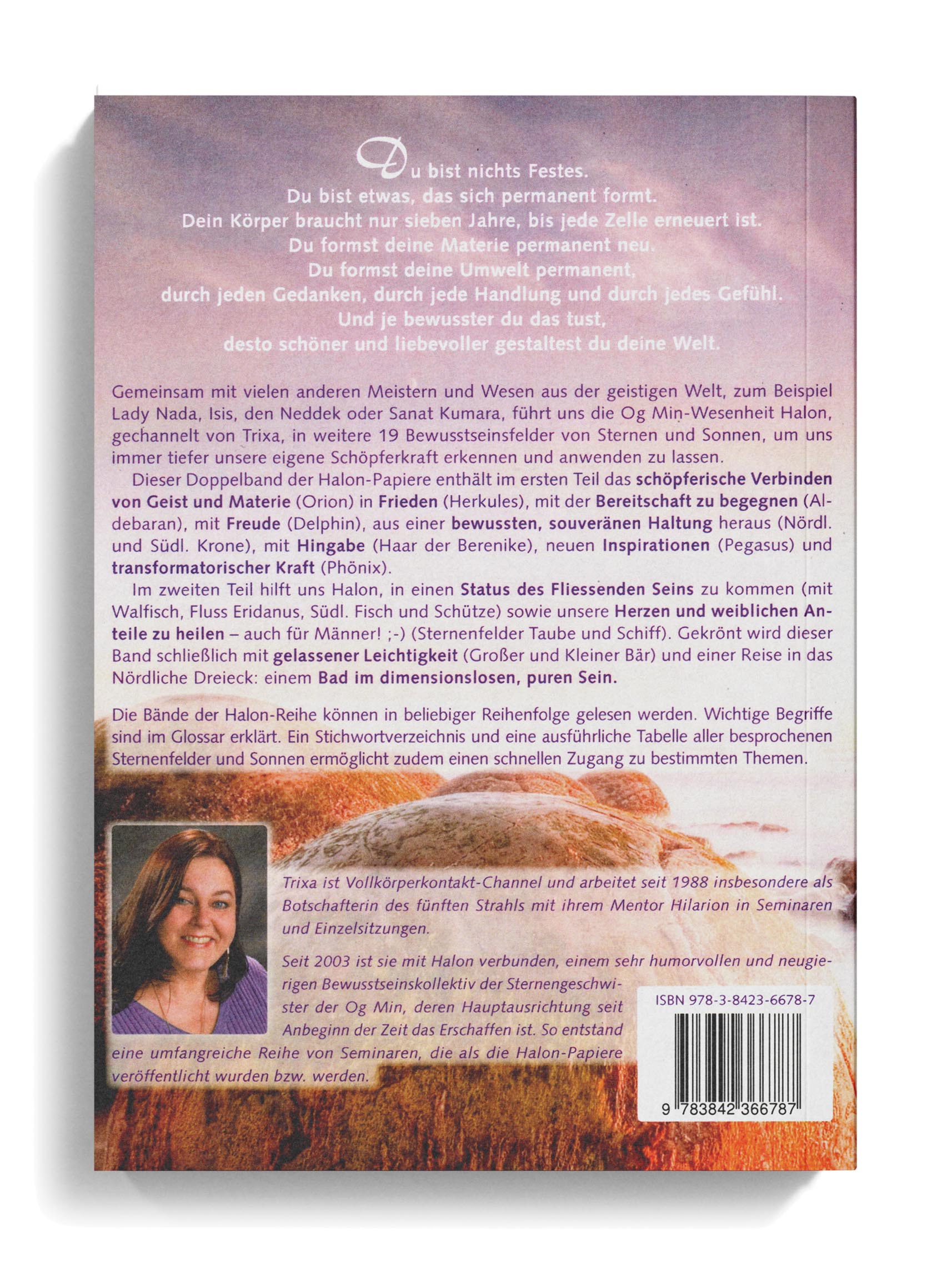 Dieser Doppelband der Halon-Papiere enthält im ersten Teil das schöpferische Verbinden von Geist und Materie (Orion), in Frieden (Herkules), mit der Bereitschaft zu begegnen (Aldebaran), mit Freude (Delphin), aus einer bewussten, souveränen Haltung heraus (nördl. und südl. Krone), mit Hingabe (Haar der Berenike) und neuen Inspirationen (Pegasus) und transformatorischer Kraft (Phönix).